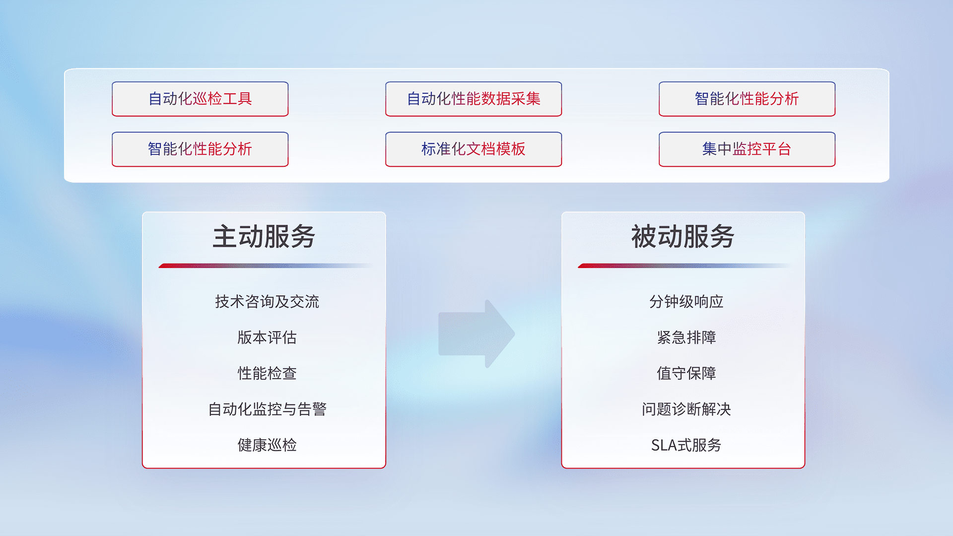智能化工具和标准化文档,,保障服务质量,,提供主动服务(包含技术咨询、、版本评估、、、性能检查、、、、自动化监控与告警、、、、健康巡检)和被动服务包含(分钟级响应、、紧急排障、、值守保障、、问题诊断解决、、、、SLA服务)。。。。
